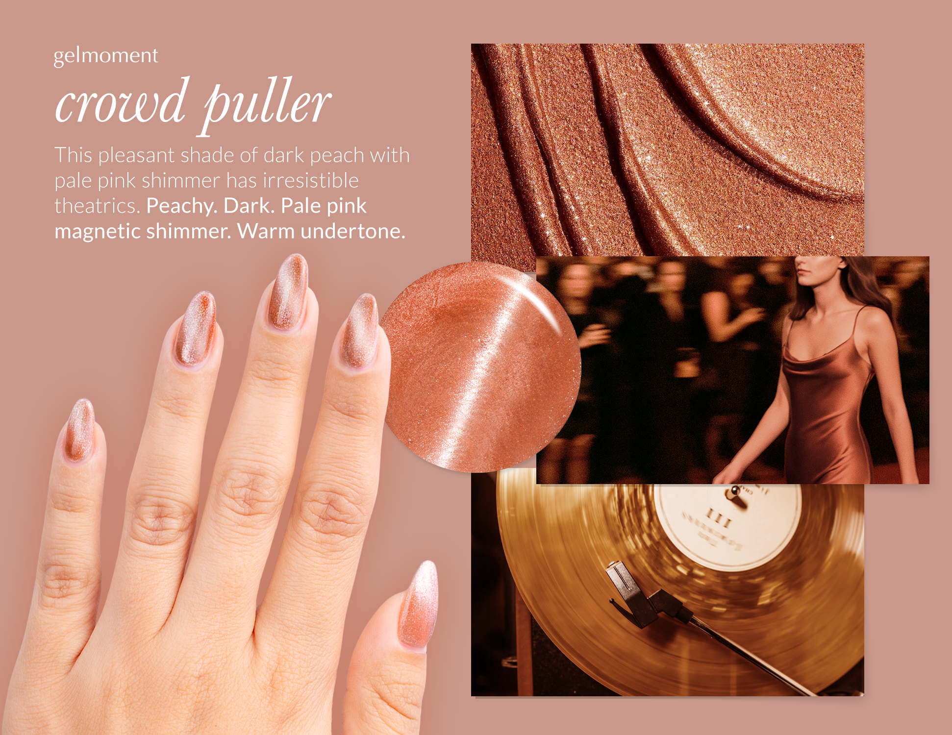 Peachy. Dark. Pale pink magnetic shimmer. Opaque. Warm undertone.